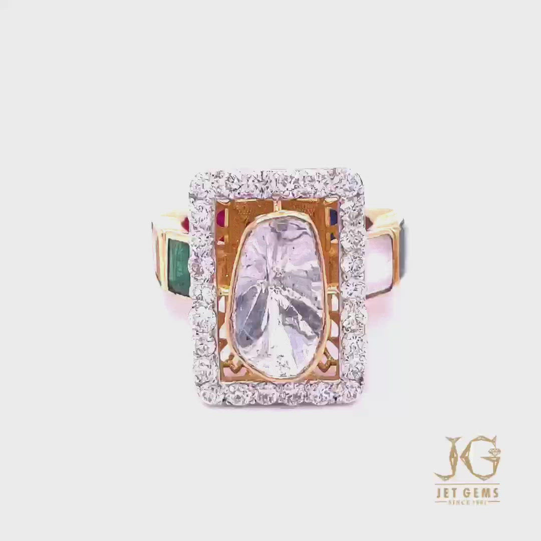 This beautiful ring features an oblong arrangement of a wide layered round diamond sequence encrusted with a charming uncut diamond at its centre. This gorgeous piece consists of a Navratna band, the shades of which project beautiful gemstone tones captivating desirability towards it.