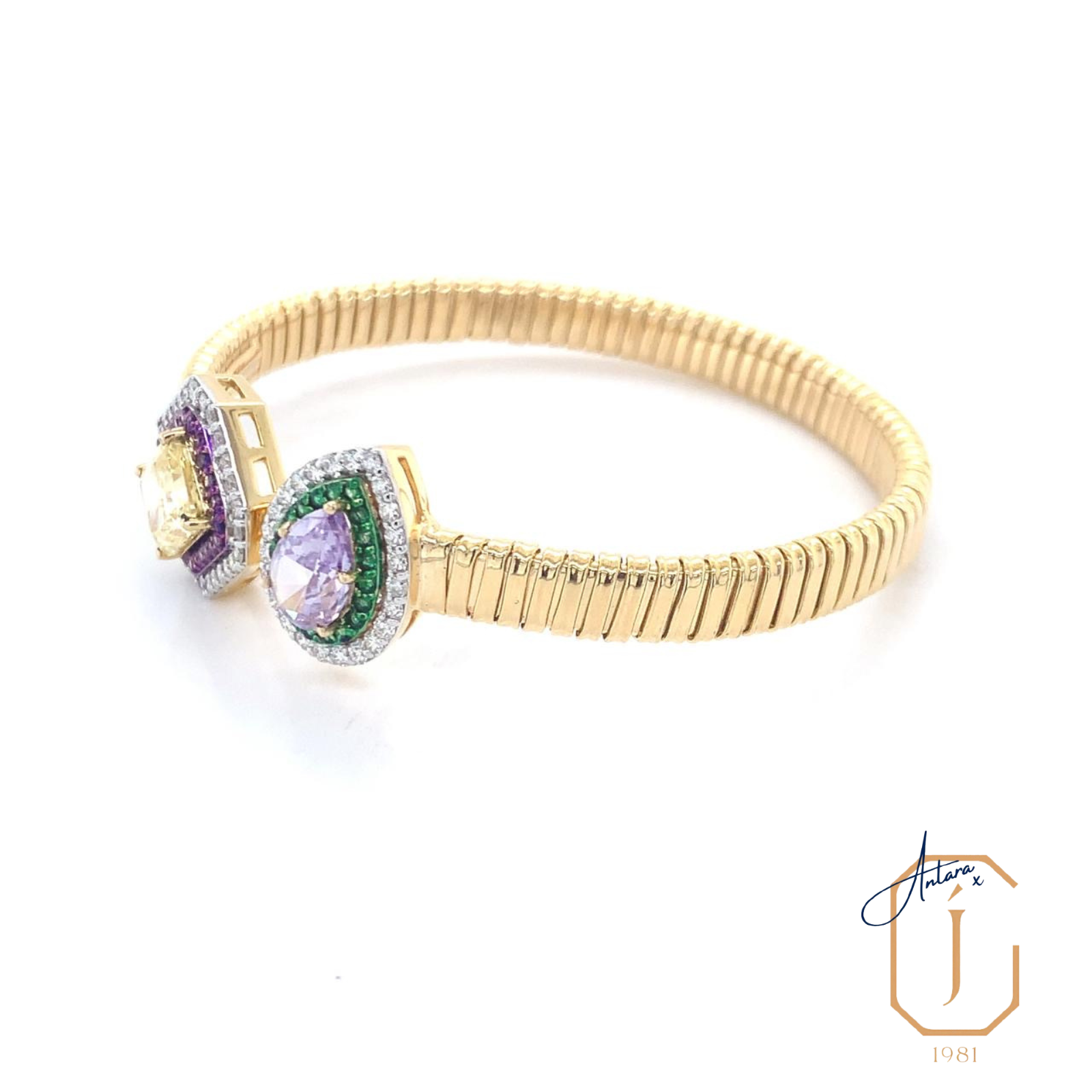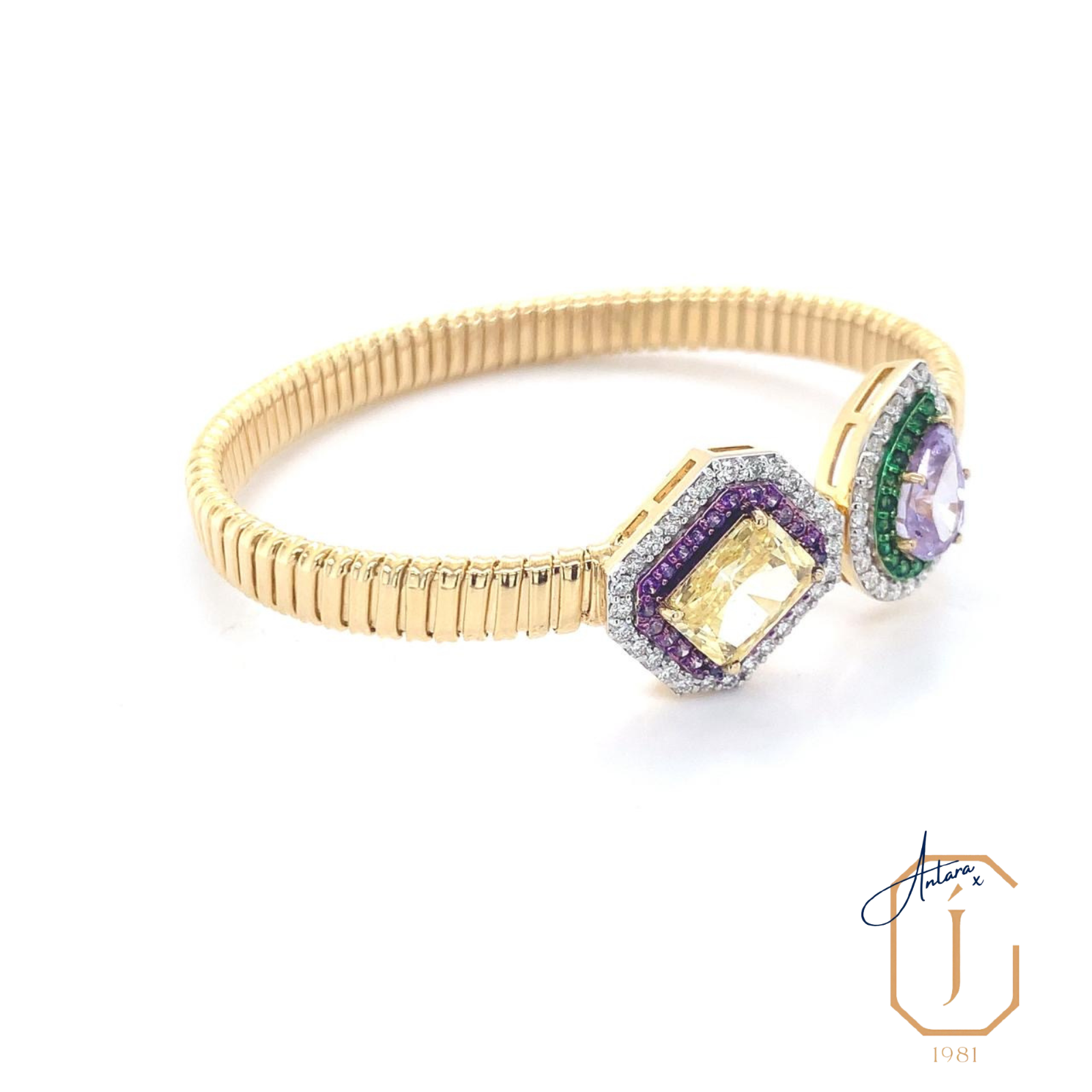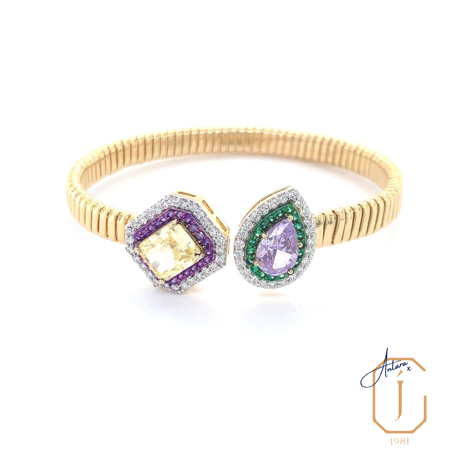 A playful exploration of duality, this open bangle brings together two contrasting candy-hued gemstones in a bold yet refined composition. One end features a soft yellow stone framed by violet accents, while the other is crowned with a lilac teardrop encircled by vivid green and shimmering diamonds. Set against a sleek ribbed gold band, the design feels structured yet expressive, modern yet indulgent.
