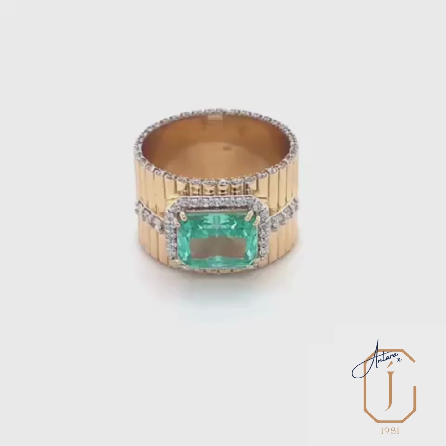 A bold statement ring defined by strong lines and saturated colour, this design features a wide ribbed gold band anchored by a rectangular aqua-hued gemstone at its centre. The stone is framed with a clean, concrete-set diamond surround, while fine diamond accents trace the band’s edges, adding subtle brilliance without softening the graphic form. The structured silhouette gives the ring a modern, architectural presence.
