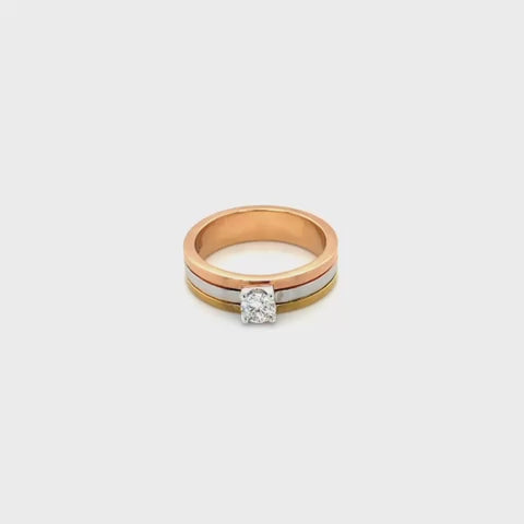 Add a touch of elegance and sophistication to your style with this stunning tri color ring. Its unique design features three bands of contrasting colors of Rose, White and Yellow Gold, creating a visually appealing and eye-catching look.